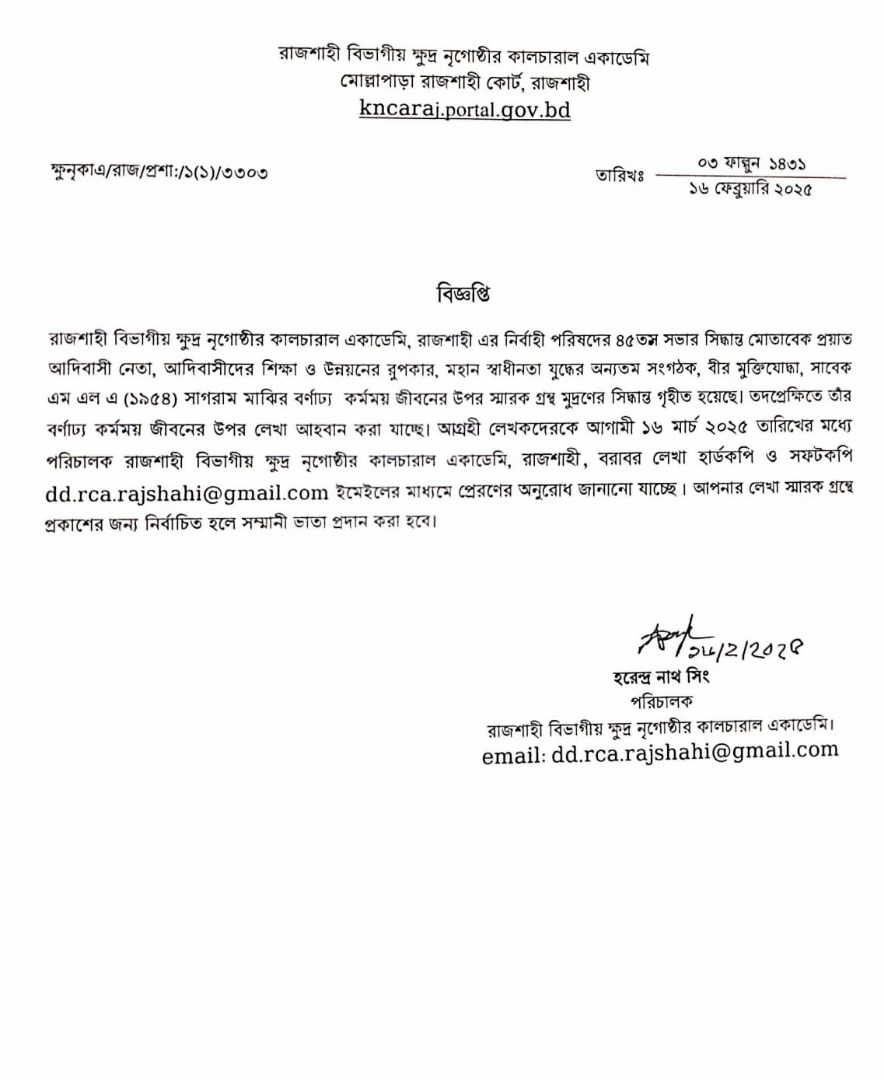 মহান স্বাধীনতা যুদ্ধের অন্যতম সংগঠক সাগরাম মাঝির বর্ণাঢ্য কর্মময় জীবনের উপর স্মারক গ্রন্থ মুদ্রণের নিমিত্ত লেখা আহবান: